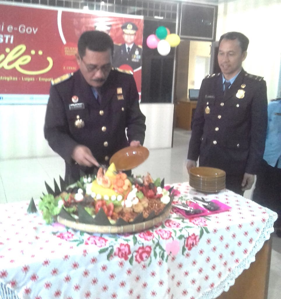 Foto : Kakanwilkumham Sumut saat menyerahkan Tumpeng kepada Kakanim Kelas II Pematangsiantar, Alrin Tambunan, SH